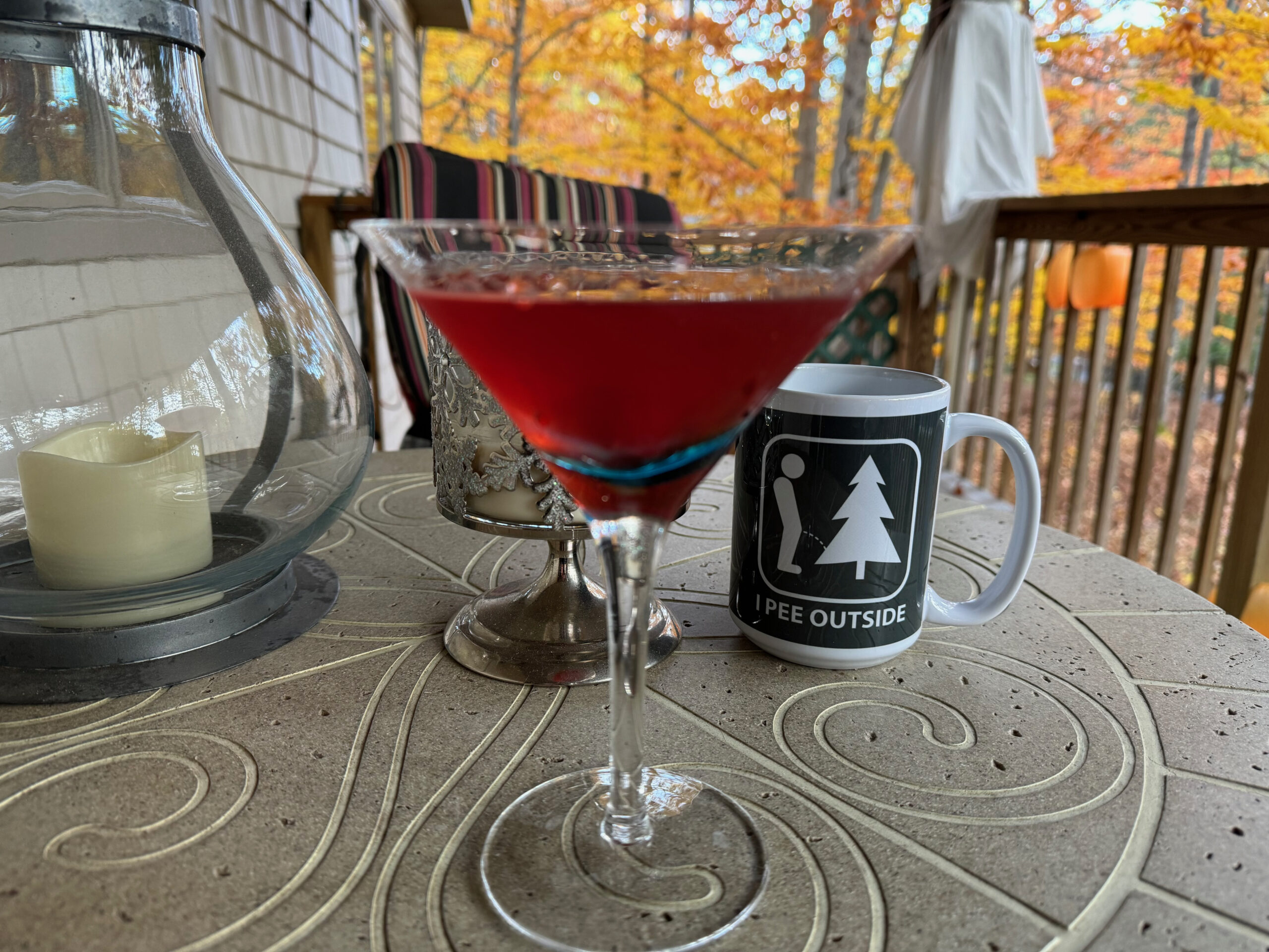 In this case, “ping” is short for pee-ing. Outside. Something I have done my whole life, mostly but not always with aplomb. Embiggen to see what’s on the mug.